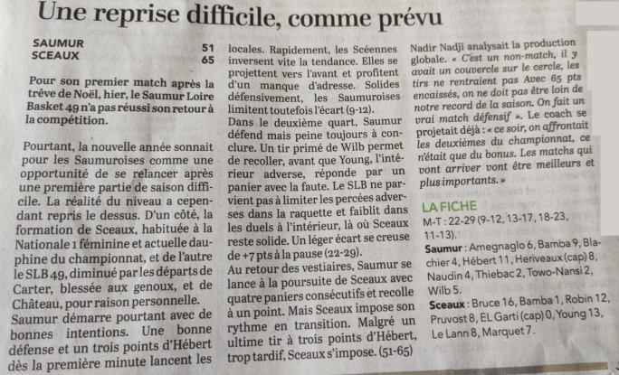 Notre équipe NF1 s'est inclinée hier soir face à Sceaux pour ce premier match de l'année 2026, et dernier match de la phase aller, sur le score de 51-65.